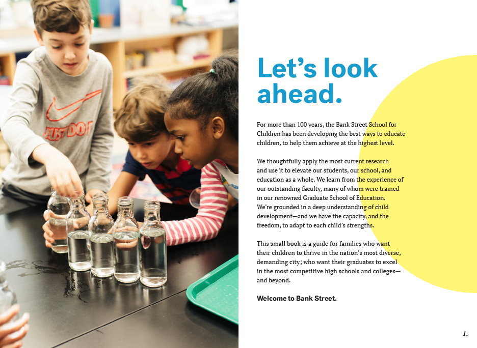 The Bank Street School for Children is an independent, coeducational preschool through 8th grade school in New York City. I designed an enrollment brochure template. These are options for the cover/back cover. They ended up going with the first design.